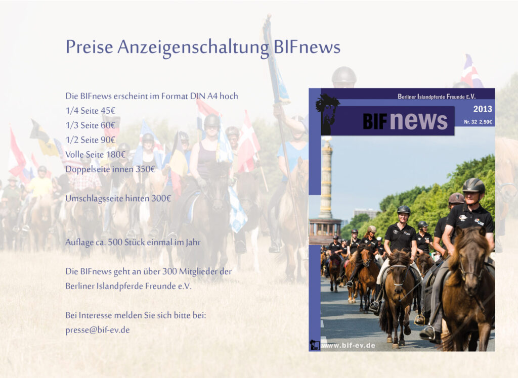 Wer gerne eine Anzeige in der Ausgabe schalten möchte, kann sich auch gerne melden. Ihr könnt damit Islandpferdeinteressierte in ganz Berlin und Brandenburg erreichen.